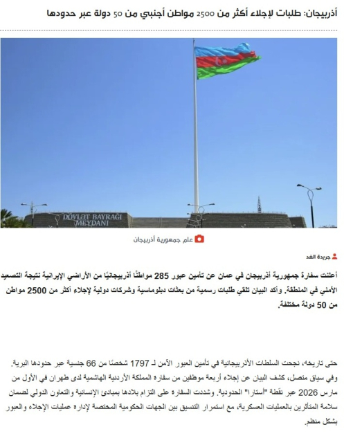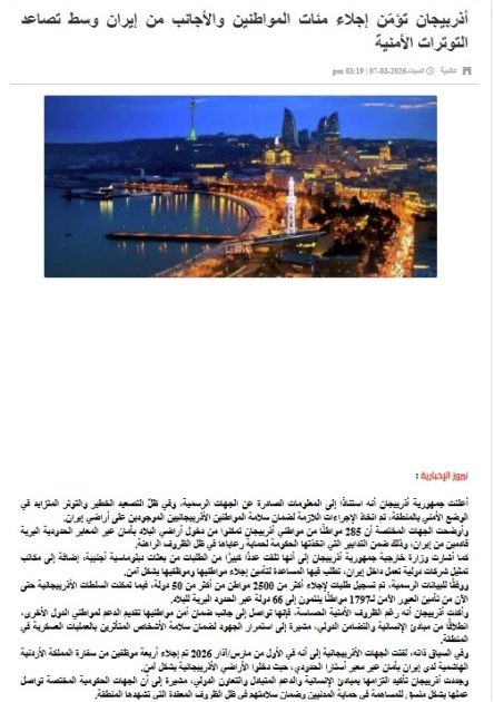 İordaniya mətbuatında regionda yaranmış gərgin təhlükəsizlik vəziyyəti fonunda Azərbaycan Respublikasının həyata keçirdiyi təxliyə tədbirləri ilə bağlı məlumatlar dərc olunub.