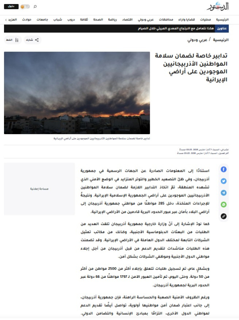 Məqalələrdə, həmçinin İran ərazisində fəaliyyət göstərən xarici diplomatik nümayəndəliklər və müxtəlif ölkələrə məxsus şirkətlərin təmsilçiləri tərəfindən Azərbaycanın Xarici İşlər Nazirliyinə çoxsaylı müraciətlərin daxil olduğu qeyd edilib. Həmin müraciətlərdə xarici dövlətlərin vətəndaşlarının və şirkət əməkdaşlarının təhlükəsiz şəkildə təxliyəsi üçün Azərbaycandan dəstək göstərilməsi xahiş edilib.
