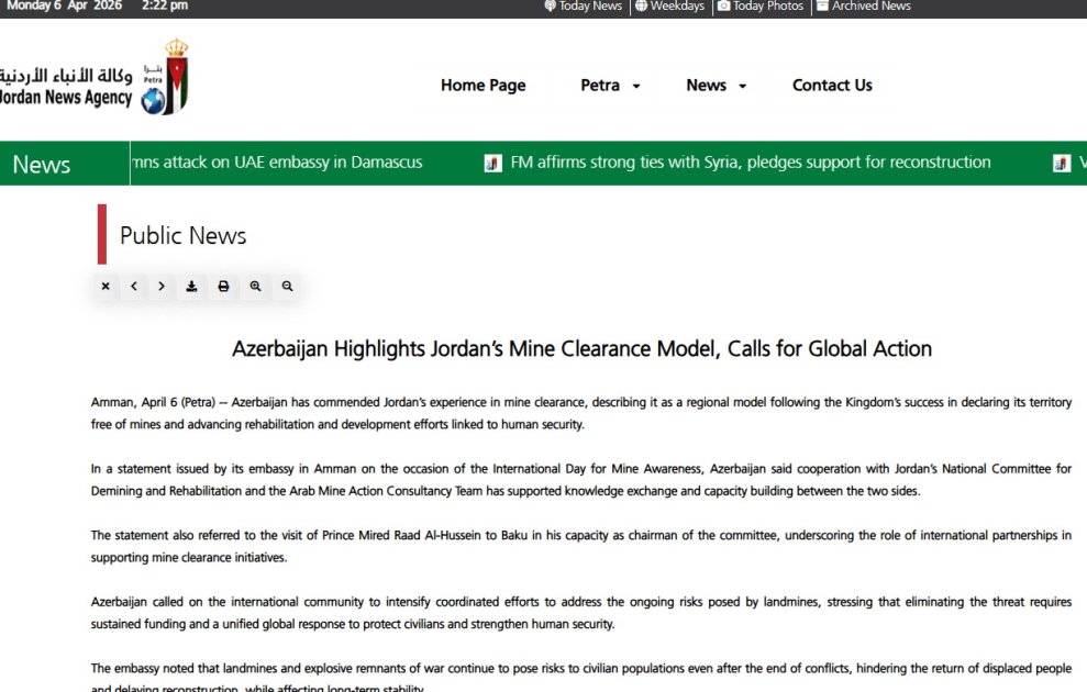 Bu barədə İordaniyanın PETRA xəbər agentliyinin Azərbaycanın Əmmandakı səfirliyinin Beynəlxalq Mina Xəbərdarlığı və Minatəmizləmə Fəaliyyətinə Yardım Günü ilə əlaqədar yaydığı bəyanata istinadla hazırladığı məqalədə əks olunub.