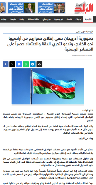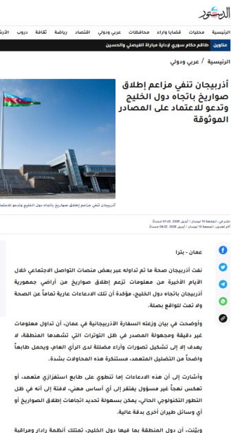 Son günlər bəzi sosial media platformalarında Azərbaycan ərazisindən Körfəz ölkələri istiqamətində guya raketlərin buraxılması ilə bağlı tamamilə əsassız və həqiqətəuyğun olmayan məlumatlar yayılıb. İordaniyanın rəsmi “Petra” xəbər agentliyi, eləcə də “əl-Dustur”, “əl-Bələd”, “Neyruz” və digər xəbər portalları Azərbaycanın Əmmandakı səfirliyinin bununla əlaqədar bəyanatını dərc edib.